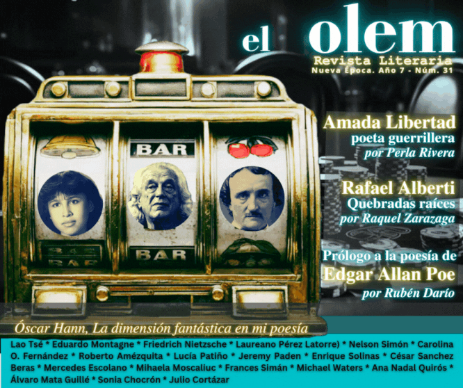 ENSAYO: Prólogo a la poesía de Edgar Allan Poe. Por Rubén Darío * Quebradas las Raíces: Rafael Alberti. Por Raquel Zarazaga Pablo * Poeta guerrillera, Amada Libertad. Por Perla Rivera * La dimensión fantástica en mi poesía. Por Óscar Hahn POESÍA: Yo también canto a América. Rafael Alberti * Mis días. Amada Libertad * El libro del sendero y de la línea recta. Lao Tsé (traducción de Eduardo Montagne) * Fama y Eternidad. Friedrich Nietzsche (traducción de Laureano Pérez Latorre) * Dimensiones Variables. Nelson Simón * Bordando quilcas. Carolina O. Fernández * Algunas rosas. Roberto Amézquita * De tripas corazón. Lucía Patiño * Geofonías. Raquel Zarazaga Pablo * Imágenes del mundo flotante. Jeremy Paden * La muerte de las palabras. Enrique Solinas * NYC Ciudad Caníbal. César Sánchez Beras * Sol y Sombra. Mercedes Escolano * Mihaela Moscaliuc (traducción de Frances Simán) * Michael Waters (traducción de Frances Simán) * Ana Nadal Quirós * Álvaro Mata Guillé * Sonia Chocrón NARRATIVA:: El demonio de la perversidad. Edgar Allan Poe (traducción de Julio Cortázar) RESEÑA: La Luz de la Palabra. Del “Sol y sombra” de Mercedes Escolano por Raquel Zarazaga