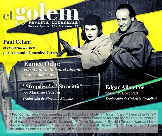 ENSAYO: Paul Celan: el recuerdo devora. Por Armando González Torres ● Eunice Odio: vibración de luz en el abismo. Por Tania Pleitez ● "Strapaese" y "Stracittà": los movimientos culturales a favor y en contra de la revolución tecnológica en la italia de los años ’20. Por Massimo Pedroni (traducción de Zingonia Zingone) ● Edgar Allan Poe. Por Howard Philips Lovecraft (traducción de Gabriela Ellena Castelloti) ● Enzia Verduchi en medio de la locura de Raúl Gómez Jattin. Por Rodríguez-Bustos JC ● POESÍA: Fuga Sobre la muerte. Por Paul Celan (traducción de Rodolfo E. Modern) ● Poesía de Eunice Odio ● Una exposición de Francis Picabia. Por Tristan Tzara (traducción de Elena de la Peña) ● Monólogos. Por Fina García Marruz ● Poesía de Raúl Gómez Jattin ● Baladas de los mares del norte. Por Mariano Rolando Andrade ● El mal parto de la luz. Por Cecilia Podestá ● Provisorios (extractos). Por Christphe Manon (traducción de Mariano Rolando Andrade) ● Poesía de Luis Benítez ● Poesía de Ali Al-Hazmi (traducción de María del Castillo Sucerquia) ● Tres poemas de Toriko Takanabe (traducción de Ryukichi Terao) ● Poesía de Wansso Kim (traducción de María del Castillo Sucerquia) ● Tres Antileyes de Newton. Por Manuel Alejandro Ceballos ● Poesía de Vanna Andreini ● Poesía de Christos R. Tisiallis (traducción de María del Castillo Sucerquia) ● NARRATIVA: Diario para mí sola (fragmentos). Por Edith Boissonnas (traducción de Hugo Alejandrez) ●