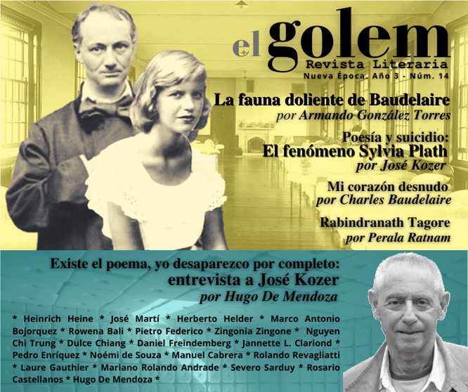 ENSAYO ● Poesía y suicidio: el fenómeno Sylvia Plath. Por José Kozer ● La fauna doliente de Baudelaire. Por Armando González Torres ● Mi Corazón desnudo (fragmentos) 200 años de Charles Baudelaire (Traducción de Agustí Esclasans) ● Rabindranath Tagore. Por Perala Ratnam ● POESÍA ● Señora Lazaro. Por Sylvia Plath (Traducción de E. L. Revol) ● Poesía de José Kozer ● Los tejedores de Silesia. Heinrich Heine (Traducción de José Martí) ● La Cuchara en la boca. Herberto Helder (Traducción de Marco Antonio Bojorquez) ● Poesía de Rowena Bali ● La mayoría de las estrellas -canto americano. Pietro Federico (Traducción de Zingonia Zingone) ● Poesía de Chi Trung (Traducción de Dulce Chiang) ● Abril (Selección de poemas) Daniel Freindemberg ● Auroras de ceniza por Jannette L. Clariond ● Poesía de Pedro Enríquez ● Deja pasar mi pueblo. Noémi de Souza (Traducción de Manuel Cabrera) ● Poesía de Rolando Revagliatti ● Kaspar de Pierre (extracto) Laure Gauthier (Traducción de Mariano Rolando Andrade) ● Poesía de Severo Sarduy ● NARRATIVA ● Lección de cocina. Rosario Castellanos ● Aparición del Tritón por Ramón Gómez de la Serna ● ENTREVISTA ● Existe el poema, yo desaparezco por completo: entrevista a José Kozer. Por Hugo De Mendoza ●