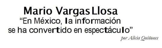 Mario Vargas (Perú-Arequipa 1936), Premio Nobel 2000. Es sin duda uno de los novelistas más importantes de nuestro tiempo. En esta entrevista concedida a Alicia Quiñones, el autor de la Fiesta del chivo 2000 nos ofrece una visión sobre el estado actual de nuestra democracia, el manejo de los medios en la información y su abundante sangre como espectáculo, el periodismo cultural y su muy temprana pasión por el teatro. —Me gusta Bach. Con estas palabras finaliza la entrevista Mario Vargas Llosa. Y sonriendo, afirma: “Soy un melómano”. El político, periodista, novelista y teatrero, originario de Perú, estuvo en México en días pasados no sólo para ser reconocido con el doctorado Honoris Causa que le otorgó la UNAM, sino también para enterarse de que este diciembre en la ciudad de Monterrey recibirá el Premio Internacional Alfonso Reyes, galardón cuya primera entrega obtuvo Borges, en 1973.Además, se anunció la publicación de su nueva novela, El sueño del celta el próximo 3 de noviembre, un lanzamiento simultáneo en todo el mundo de habla hispana. Las razones políticas y literarias de Vargas Llosa tienen su punto de partida en la niñez. Nació en Arequipa, donde volvió nueve años después de radicar en Bolivia. Volvía a un Perú que “me pintaban pacífico”. Pero ahí estaba la dictadura política y militar con la que el escritor aprendió el significado de la censura. “Mi generación padeció esa dictadura la de Manuel Odría. Toda nuestra juventud la pasamos durante ese sistema, y desapareció cuando ya éramos hombres hechos y derechos, de tal manera que esos años son los vivimos en una sociedad en la que la vida política estaba erradicada. La única forma de actividad política era la clandestinidad… Vivíamos en la cultura de la ignorancia…”, confesó en la charla que sostuvo con Sealtiel Alatriste en la UNAM.