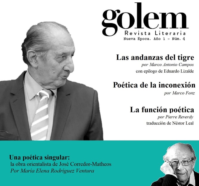 Las andanzas del tigre. Por Marco Antonio Campos (con epílogo de Eduardo Lizalde) ● Una poética singular: la obra orientalista de José Corredor-Matheos. Por María Elena Rodríguez Ventura ● La poética de la inconexión. Por Marco Fonz ● La función poética. Por Pierre Reverdy (traducción de Néstor Leal) ● Abraham y Lot. Por Martin Buber (Traducción de Aarón Spivak) ● Brevedades a la carta. Por Armando Alanís ● Poesía de Eduardo Lizalde ● Poesía de José Corredor-Matheos ● Poesía de Julia Santibáñez ● Animal Escandaloso. Poema de Osaki Sayaka (traducción de Daniela Camacho) ● El aprendiz de mago. Poema de Johann Wolfgang von Goethe (traducción de Rafael Cansinos Asséns) ● Poesía de Alicja Maria Kuberska (traducción de Alicia Minjarez Ramírez) ● Trece-treceadas. Poemas de Roberto López Moreno ● Poesía de Jorge Valbuena ● Poesía de Jorge Contreras Herrera ● Poesía de Bernard Boua Dadié (versiones de Antonia María Tristá y David Chericián) ● Relación de hechos deslenguados. Por Daniel Téllez ● Ballena 52: un canto triste en la soledad del mundo. Por Hugo De Mendoza ●