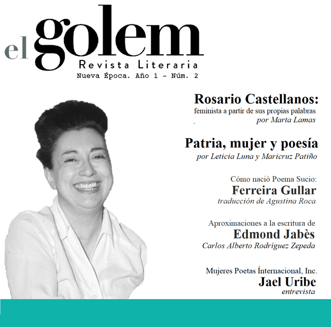 Rosario Castellanos: Feminista a partir de sus propias palabras. Por Marta Lamas ●Patria, mujer y poesía. Por Leticia Luna y Maricruz Patiño ● La hierba negra (fragmento). Por Ioana Nicolaie (traducción de Elena Borrás) ● El rumor del vacío:aproximaciones a la escritura de Edmond Jabès. Por Carlos Alberto Rodríguez Zepeda ●Poesía de Marosa di Giorgio ● Poesía de Chary Gumeta ● Poesía de Gisèle Prassinos (traducciones de César Moro y Aldo Pelligrini) ● Poesía de Natalia Litvinova ●Poesía de Olga Orozco ● Poesía de Safo (traducción de Rubén Bonifaz Nuño) ● Poesía de Rosario Castellanos ● Poesía de Gustavo Barrera Calderón ● Poesía de Mutsuo Takahashi (traducción de Daniela Camacho) ● Cómo nació Poema Sucio Por Ferreira Gullar (traducción de Agustina Roca) ● A tiempo y no (relato). Por Alejandra Pizarnik ● Jael Uribe: Mujeres Poetas Internacional, Inc. Entrevista por Dulce Chiang.