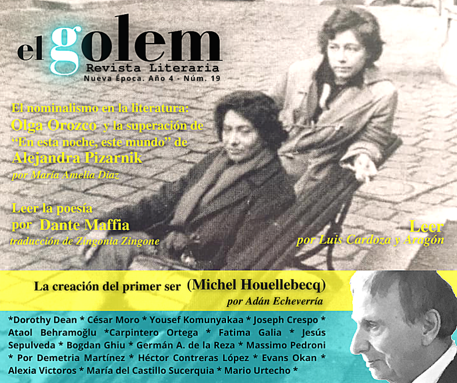 ENSAYO: El nominalismo en la literatura: Olga Orozco y la superación de “En esta noche, este mundo” de Alejandra Pizarnik. Por María Amelia Diaz * La creación del primer ser (Michel Houellebecq). Por Adán Echeverría * Leer la poesía. Por Dante Maffia (Traducción de Zingonia Zingone) * Leer. Por Luis Cardoza y Aragón * Homenaje a un árbol. Por Dorothy Dean Walton * POESÍA: La Enlutada. Olga Orozco * La tierra más ajena. Alejandra Pizarnik *La vida escandalosa de César Moro. Por César Moro * Túneles. Por Yousef Komunyakaa (Traducción de Joseph Crespo) * Poemas de Ataol Behramoğlu (Traducción de Rafael Carpintero Ortega) * La biblioteca de Alejandría. Por Dante Maffia (Traducción de Zingonia Zingone) * Poemas saharauis para crecer. Por Fatima Galia * Espejo de los detalles. Por Jesús Sepulveda * Cuando escribiendo, te tardas en aparecer. Por Bogdan Ghiu (Traducción de Germán A. de la Reza) * Noche. Por Massimo Pedroni (Traducción de Zingonia Zingone) * Poesía de María Amelia Diaz * La ira de la noche. Adán Echeverría * La palabra en la vigilia y en el sueño. Por Demetria Martínez (Traducción de Héctor Contreras López) * Raíces y destino. Por Evans Okan * Poesía de Alexia Victoros (Traducción de María del Castillo Sucerquia) * NARRATIVA: Microrrelatos. Por Mario Urtecho* PRESENTACIÓN: A volte nella vita / A veces en la vida de Carmen Nozal. Por Héctor Carreto