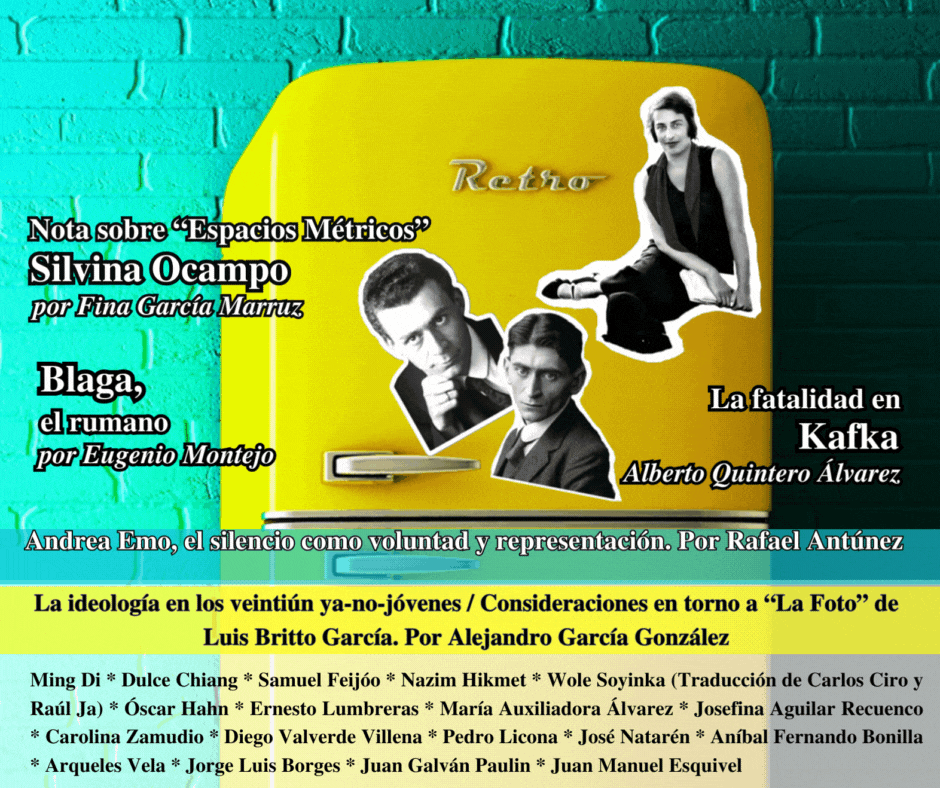 ENSAYO: La fatalidad en Kafka. Por Alberto Quintero Álvarez * Blaga, el rumano. Por Eugenio Montejo * Nota sobre “Espacios Métricos”, Silvina Ocampo. Por Fina García Marruz * Andrea Emo, el silencio como voluntad y representación. Por Rafael Antúnez * La ideología en los veintiún ya-no-jovenes / Consideraciones en torno a “La Foto” de Luis Britto García. Por Alejandro García González * POESÍA: Silencio. Lucian Blaga (traducción de Héctor Seijas) * Poemas breves. Silvina Ocampo * Sonetos Tanáticos. Samuel Feijóo * Mientras aún hay tiempo. Nazim Hikmet * Conversación telefónica. Wole Soyinka (traducción de Carlos Ciro y Raúl Ja) * Muerte de un poeta. Óscar Hahn * Tablas de restar. Ernesto Lumbreras * Poesía de María Auxiliadora Álvarez * Fantasmas de la Atlántida. Josefina Aguilar Recuenco * Una isla desierta. Carolina Zamudio * Poesía de Diego Valverde Villena * Poesía de Pedro Licona * Quién llama a la puerta. José Natarén * Íntimos fragmentos. Aníbal Fernando Bonilla * Poesía de Ming Di (traducción de Dulce Chiang) NARRATIVA: La sentencia. Franz Kafka (Traducción de Arqueles Vela) * Estambul. Jorge Luis BorgesENTREVISTA: Juan Galván Paulín por Juan Manuel Esquivel