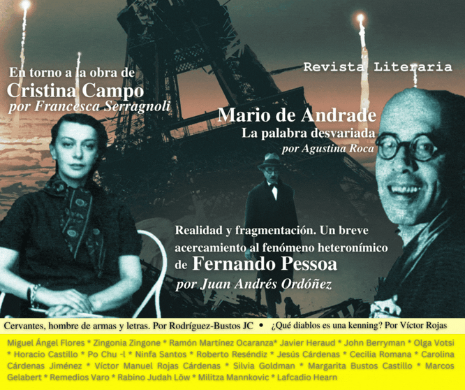 ENSAYO: Los grados de la poesía lírica. Por Fernando Pessoa (Traducción de Juan Andrés Ordóñez) * Realidad y fragmentación. Un breve acercamiento al fenómeno heteronímico de Fernando Pessoa. Por Juan Andrés Ordóñez * Mario de Andrade, la palabra desvariada. Por Agustina Roca *  En torno a la obra de Cristina Campo. Por Francesca Serragnoli * Cervantes, hombre de armas y letras. Por Rodríguez-Bustos JC * ¿Qué diablos es una kenning? Por Víctor RojasPOESÍA: Improvisación de un joven muerto. Mario de Andrade (Traducción de Miguel Ángel Flores) * La tigre Assenza. Cristina Campo (Traducción de Zingonia Zingone) * Horas de otoño. Ramón Martínez Ocaranza * Viajes Imaginarios. Javier Heraud * Canciones de Sueño. John Berryman * Círculos de existencia. Olga Votsi (Traducción de Horacio Castillo) * Sentado en meditación Po Chu  -l * Si nada más me oyeras. Ninfa Santos * También nosotros volamos papalotes. Roberto Reséndiz * Desvestir el cuerpo. Jesús Cárdenas * Aquí no hay viento. Cecilia Romana * Caen cenizas sobre la ciudad. Carolina Cárdenas Jiménez * Los Vikingos saquean París. Víctor Manuel Rojas Cárdenas * Poesía de Silvia Goldman * Una ciudad para existir.  Margarita Bustos Castillo * Trilogía del confinamiento. Marcos Gelabert (Traducción de Zingonia Zingone) * Receta para provocar sueños eróticos. Remedios Varo * NARRATIVA: El Golem de Rabino Judah Löw (Traducción de Militza Mannkovic) * El último decapitado. Lafcadio Hearn