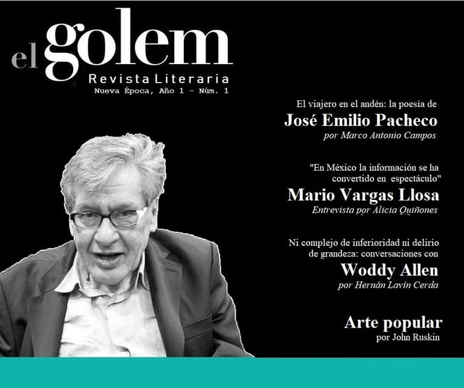 El viajero en el andén: la poesía de José Emilio Pacheco. Por Marco Antonio Campos Poesía de José Emilio Pacheco  Poesía de Ernesto Cardenal  Poesía de Mahfud Massis  Conversaciones con Woody Allen: Ni complejo de inferioridad ni delirio de grandeza. Por Hernán Lavín Cerda  Algo dulce, Cinco minutos de relax. Por Paolo Lagazzi Poesía de Juan Arabia  Poesía de Emilie Robert (Traducción de Emilie Robert)  Poesía de Emilie Robert (español)   Soy como un árbol. Por Ángel Gaztelu  Arte popular. Por John Ruskin   “En México, la información se ha convertido en espectáculo”: Mario Vargas Llosa. Entrevista por Alicia Quiñones  Poesía de Kim Jensen (Traducción de Luisa Isabel Villa Meriño, Marie Murphy, Laura Saldarriaga Correa)  Un pequeño incidente (cuento). Por Lu Sin Antonin Artaud. Poema de René Char (Traducción de Emilie Robert)  La hiperbólica caída del insólito niño Webber o a la añoranza de la carne. Reseña por José Manuel Cuéllar Moreno Poesía de Juan Romero Vinueza