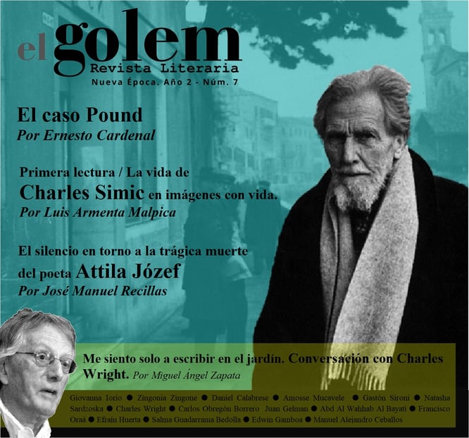 El caso Pound. Por Ernesto Cardenal  Primera lectura / La vida de Charles Simic en imágenes con vida. Por Luis Armenta Malpica El silencio en torno a la trágica muerte del poeta Attila Józef. Por José Manuel Recillas Me siento solo a escribir  en el jardín: conversaciones con Charles Wright. Entrevista por Miguel Ángel Zapata La nieve está en otra parte. Poesía de Giovanna Iorio. Selección y traducción de Zingonia Zingone Poesía de Daniel Calabrese Poesía de Amosse Mucavele. Traducción de Gastón Sironi Poesía de Natasha Sardzoska. Traducción de Natasha Sardzoska Poesía de Charles Wright. Traducción de Miguel Ángel Zapata Poesía de Carlos Obregón Borrero. Introducción y selección de Zingonia Zingone Poesía de Ezra Pound Zapatitos. Poema de Juan Gelman Escritos de algunos condenados a muerte después de la caída de la Comuna de París. Poema de Abd Al Wahhab Al Bayati. Traducción de Francisco Oraá Elegía de Lídice. Poema de Efraín Huerta Nada. Micro cuento de Salma Guadarrama Bedolla El sueño del Faraón. Cuento de Edwin Gamboa Al día siguiente. Cuento de Manuel Alejandro Ceballos