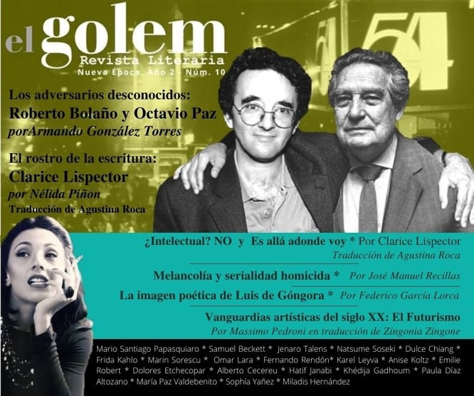 ENSAYO  Los adversarios desconocidos: Roberto Bolaño y Octavio Paz. Por Armando González Torres  El Rostro de la escritura. Por Nélida Piñon (traducción de Agustina Roca)  Melancolía y serialidad homicida. Por José Manuel Recillas  La imagen poética de Luis de Góngora. Por Federico García Lorca  Vanguardias artísticas del siglo XX: El Futurismo. Por Massimo Pedroni (traducción de Zingonia Zingone) POESÍA  Aullido de cisne: 5 poemas de Mario Santiago Papasquiaro  Dieppe, poema de Samuel Beckett (traducción de Jenaro Talens)  Haikus. Natsume Soseki (traducción del Dulce Chiang)  1935. Poema de Frida Kahlo Poesía de Marin Sorescu (traducción de Omar Lara)  En Flotación. Fernando Rendón  Poesía de Karel Leyva  Poesía de Anise Koltz (traducción de Emilie Robert)  Poesía de Dolores Etchecopar  Poesía de Alberto Cecereu  Poesía de Hatif Janabi (traducción de Khédija Gadhoum)  3 poemas del libro Ríos de carretera de Paula Díaz Altozano  Poesía de María Paz Valdebenito  Poesía de Sophía Yañez  Poesía de Miladis Hernández   NARRATIVA  ¿Intelectual? No. Por Clarice Lispector (traducción de Agustina Roca)  Es allá adonde voy. Por Clarice Lispector (traducción de Agustina Roca)