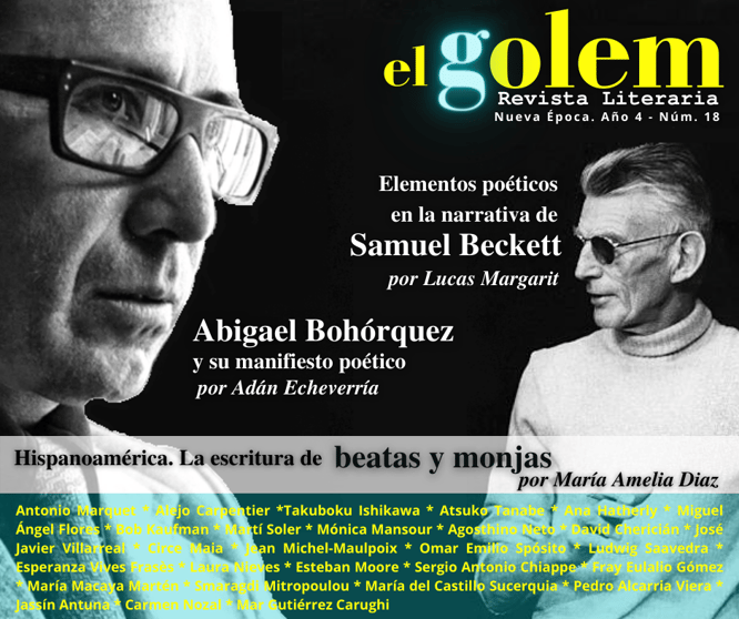 ENSAYO: Elementos poéticos en la narrativa de Samuel Beckett. Por Lucas Margarit * Abigael Bohórquez y su manifiesto poético. Por Adán Echeverría * Hispanoamérica. La escritura de monjas y beatas. Por María Amelia Diaz * NARRATIVA: Sobresaltos. Samuel Beckett (Traducción de Antonio Marquet) -Relato- * POESÍA: Navegación en Yoremito. Abigael Bohórquez * Liturgia. Alejo Carpentier * Tankas. Takuboku Ishikawa (Traducción de Atsuko Tanabe) * Alicia en el país de las maravillas. Ana Hatherly (Traducción de Miguel Ángel Flores) * Nota de Blues. Bob Kaufman (Traducción de Martí Soler y Mónica Mansour) * Poemas de Agosthino Neto. (Traducción de David Chericián) * Los secretos engarces. José Javier Villarreal * de lo visible. Circe Maia * Bernart Metge. Lucas Margarit * El sueño de la tierra. Jean Michel-Maulpoix (Traducción de Omar Emilio Spósito) * FREE-STYLE. Ludwig Saavedra * Poesía de Esperanza Vives Frasès * Poesía de Laura Nieves * Poesía de Esteban Moore * Poesía de Sergio Antonio Chiappe * Poesía de Fray Eulalio Gómez * Poesía de María Macaya Martén * Poesía de Smaragdi Mitropoulou (Traducción de María del Castillo Sucerquia) * Poesía de Pedro Alcarria Viera * Poesía de Jassín Antuna * RESEÑA: Poesía Reunida 1991-2021 de Carmen Nozal
