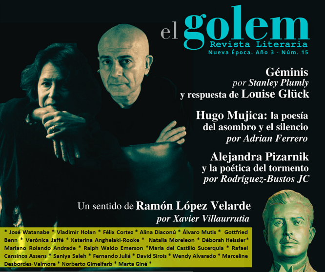 ENSAYO  Géminis. Por Stanley Plumly, con de respuesta de Louise Glück (Traducción de Juan Manuel Esquivel)   Hugo Mujica: la poesía del asombro y el silencio. Por Adrián Ferrero   Un sentido de Ramón López Velarde. Por Xavier Villaurrutia   Alejandra Pizarnik y la poética del tormento. Por Rodríguez-Bustos  JC  POESÍA  Poesía de Hugo Mujica  Tres poemas de Louise Glück (Traducción de Juan Manuel Esquivel Álbum de familia. José Watanabe  Oda a la Alegría. Vladimir Holan (Traducción de Félix Cortez Rosas del Desierto. Alina Diaconú  Poema de lástimas a la Muerte de Marcel ProustÁlvaro Mutis  Morgue y otros poemas. Gottfried Benn (Traducción de Verónica Jaffé Dice Penélope. Katerina Anghelaki-Rooke (Traducción de Natalia Moreleon)  Como un fragmento de noche, recortado de su poema (Extractos). Déborah Heissler (Traducción de Mariano Rolando Andrade)  Himno a la concordia. Ralph Waldo Emerson (Traducción de María del Castillo Sucerquia El muerto ante la vida. Rafael Cansinos Assens  Los restos de la única ventana. Saniya Saleh (Traducción de Fernando Juliá Poesía de David Sirois (Traducción de María del Castillo Sucerquia Poesía de Wendy Alvarado  Poesía de Marceline Desbordes-Valmore. (Traducción de Norberto Gimelfarb y Marta Giné