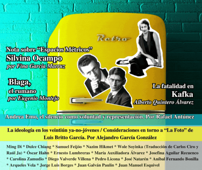 ENSAYO: La fatalidad en Kafka. Por Alberto Quintero Álvarez * Blaga, el rumano. Por Eugenio Montejo * Nota sobre “Espacios Métricos”, Silvina Ocampo. Por Fina García Marruz * Andrea Emo, el silencio como voluntad y representación. Por Rafael Antúnez * La ideología en los veintiún ya-no-jovenes / Consideraciones en torno a “La Foto” de Luis Britto García. Por Alejandro García González * POESÍA: Silencio. Lucian Blaga (traducción de Héctor Seijas) * Poemas breves. Silvina Ocampo * Sonetos Tanáticos. Samuel Feijóo * Mientras aún hay tiempo. Nazim Hikmet * Conversación telefónica. Wole Soyinka (traducción de Carlos Ciro y Raúl Ja) * Muerte de un poeta. Óscar Hahn * Tablas de restar. Ernesto Lumbreras * Poesía de María Auxiliadora Álvarez * Fantasmas de la Atlántida. Josefina Aguilar Recuenco * Una isla desierta. Carolina Zamudio * Poesía de Diego Valverde Villena * Poesía de Pedro Licona * Quién llama a la puerta. José Natarén * Íntimos fragmentos. Aníbal Fernando Bonilla * Poesía de Ming Di (traducción de Dulce Chiang) NARRATIVA: La sentencia. Franz Kafka (Traducción de Arqueles Vela) * Estambul. Jorge Luis Borges * ENTREVISTA: Juan Galván Paulín por Juan Manuel Esquivel