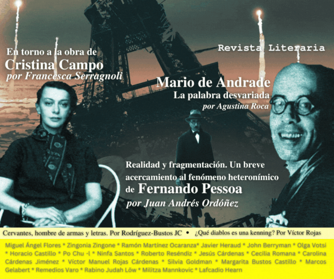 ENSAYO: Los grados de la poesía lírica. Por Fernando Pessoa (Traducción de Juan Andrés Ordóñez) * Realidad y fragmentación. Un breve acercamiento al fenómeno heteronímico de Fernando Pessoa. Por Juan Andrés Ordóñez * Mario de Andrade, la palabra desvariada. Por Agustina Roca * En torno a la obra de Cristina Campo. Por Francesca Serragnoli * Cervantes, hombre de armas y letras. Por Rodríguez-Bustos JC * ¿Qué diablos es una kenning? Por Víctor Rojas * POESÍA: Improvisación de un joven muerto. Mario de Andrade (Traducción de Miguel Ángel Flores) * La tigre Assenza. Cristina Campo (Traducción de Zingonia Zingone) * Horas de otoño. Ramón Martínez Ocaranza * Viajes Imaginarios. Javier Heraud * Canciones de Sueño. John Berryman * Círculos de existencia. Olga Votsi (Traducción de Horacio Castillo) * Sentado en meditación Po Chu -l * Si nada más me oyeras. Ninfa Santos * También nosotros volamos papalotes. Roberto Reséndiz * Desvestir el cuerpo. Jesús Cárdenas * Aquí no hay viento. Cecilia Romana * Caen cenizas sobre la ciudad. Carolina Cárdenas Jiménez * Los Vikingos saquean París. Víctor Manuel Rojas Cárdenas * Poesía de Silvia Goldman * Una ciudad para existir. Margarita Bustos Castillo * Trilogía del confinamiento. Marcos Gelabert (Traducción de Zingonia Zingone) * Receta para provocar sueños eróticos. Remedios Varo * NARRATIVA: El Golem de Rabino Judah Löw (Traducción de Militza Mannkovic) * El último decapitado. Lafcadio Hearn