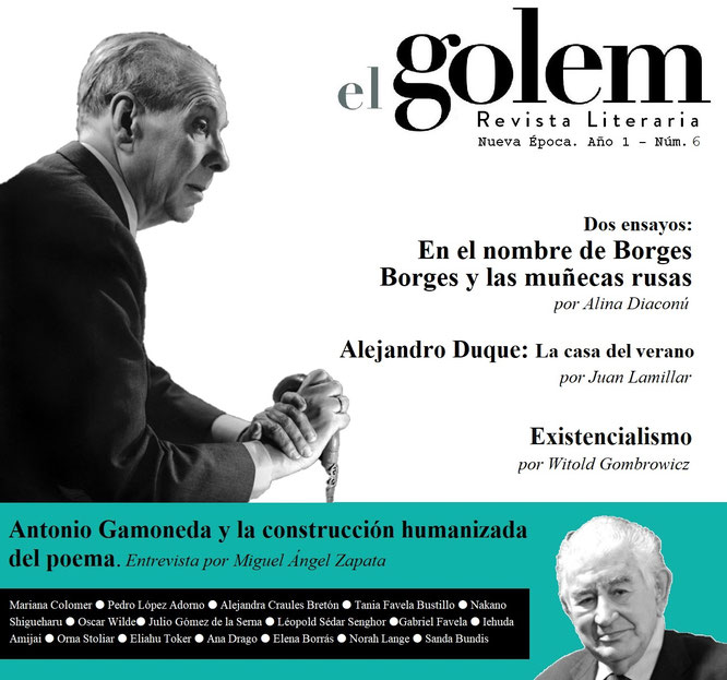 Dos Ensayos: 1. En el nombre de Borges 2. Borges y las muñecas rusas. Por Alina Diaconú ● Alejandro Duque: La casa del verano. Por Juan Lamillar ● Existencialismo. Por Witold Gombrowicz ● Antonio Gamoneda y la construcción humanizada del poema. Entrevista de Miguel Ángel Zapata ● Poesía de Mariana Colomer ● Poesía de Alejandro Duque Amusco ● Poesía de Pedro López Adorno ● Poesía de Alejandra Craules Bretón ● Poesía de Tania Favela Bustillo (selección de Willy Gómez Migliaro) ● Poesía de Nakano Shigueharu ● Hélas (Poema en prosa) Oscar Wilde. Traducción de Julio Gómez de la Serna ● Cantos para Naëtt. Léopold Sédar Senghor. Traducción de Gabriel Favela ● La mano de Dios en el mundo. Iehuda Amijai. Traducción de Orna Stoliar y Eliahu Toker ● Mamá, se me escurren los dedos. Por Ana Drago. Traducción de Elena Borrás ● 45 Días y 30 Marineros. Por Norah Lange ● Mi matrimonio o cómo la novia se roba a sus suegros (Del volumen La hija del padre y la madre de la hija. Historia de una vida entre Rumanía y Suiza) Sanda Bundis. Traducción de Elena Borrás