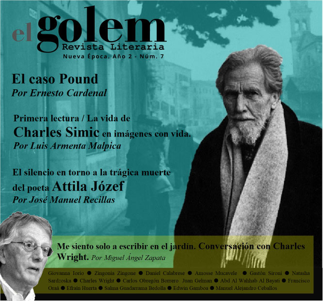 El caso Pound. Por Ernesto Cardenal ● Primera lectura / La vida de Charles Simic en imágenes con vida. Por Luis Armenta Malpica ● El silencio en torno a la trágica muerte del poeta Attila Józef. Por José Manuel Recillas ● Me siento solo a escribir en el jardín: conversaciones con Charles Wright. Entrevista por Miguel Ángel Zapata ● La nieve está en otra parte. Poesía de Giovanna Iorio. Selección y traducción de Zingonia Zingone ● Poesía de Daniel Calabrese ● Poesía de Amosse Mucavele. Traducción de Gastón Sironi ● Poesía de Natasha Sardzoska. Traducción de Natasha Sardzoska ● Poesía de Charles Wright. Traducción de Miguel Ángel Zapata ● Poesía de Carlos Obregón Borrero. Introducción y selección de Zingonia Zingone ● Poesía de Ezra Pound ● Zapatitos. Poema de Juan Gelman ● Escritos de algunos condenados a muerte después de la caída de la Comuna de París. Poema de Abd Al Wahhab Al Bayati. Traducción de Francisco Oraá ● Elegía de Lídice. Poema de Efraín Huerta ● Nada. Micro cuento de Salma Guadarrama Bedolla ● El sueño del Faraón. Cuento de Edwin Gamboa ● Al día siguiente. Cuento de Manuel Alejandro Ceballos
