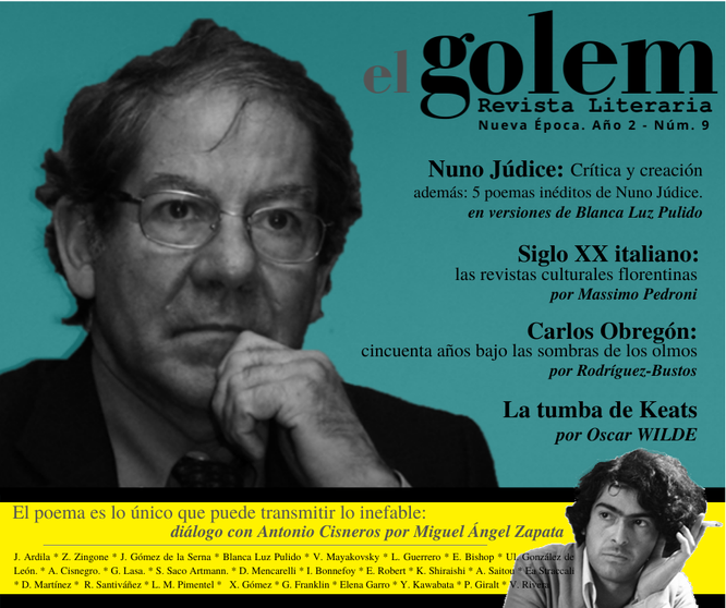 Crítica y creación. Por Nuno Júdice. (Traducción de Jineth Ardila) ● Siglo XX italiano: Las revistas culturales florentinas. Por Massimo Pedroni. (Traducción de Zingonia Zingone) ● Carlos Obregón: cincuenta años bajo la sombra de los olmos. Por Rodríguez-Bustos JC ● La Tumba de Keats. Por Oscar Wilde. (Traducción de Julio Gómez de la Serna) ● El poema es lo único que puede transmitir lo inefable: diálogo con Antonio Cisneros. Por Miguel Ángel Zapata) ● 5 Poemas inéditos de Nuno Júdice. (Versiones de Blanca Luz Pulido) ● 150.000.000 Poema de Vladimir Mayakovsky. (Traducción de Lila Guerrero) ● El Iceberg imaginario. Poema de Elizabeth Bishop (Traducción de Ulalume González de León) ● Cánticas de amor y crueldad: poesía de Andrés Cisnegro. ● El espasmo y la quietud: poesía de Gorka Lasa ● Poemas del libro inédito Diálogos Brujos. Susana Saco Artmann ● Poesía de Daniele Mencarelli (Traducción de Zingonia Zingone) ● Poesía de Yves Bonnefoy (Traducción de Emilie Robert) ● Poesía de Kazuko Shiraishi. (Traducción de Ayako Saitou) ● Poesía de Eugenia Straccali ● Poesía de Dira Martínez Mendoza ● Poesía de Roger Santiváñez ● Poesía de Luis Manuel Pimentel ● Poesía de Ximena Gómez ● Poesía de George Franklin (Traducción de Ximena Gómez) ● Teología. Por Elena Garro (cuento corto) ● Un brazo. Por Yusinare Kawabata (relato en traducción de Pilar Giralt) ● Cartas a Clarice Lispector. Por Víctor Rivera