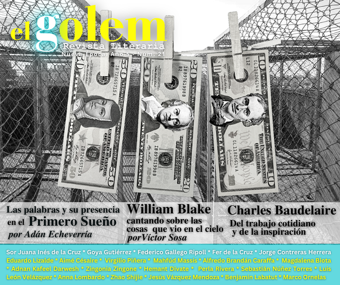 ENSAYO: Las palabras y su presencia en el Primero Sueño. Por Adán Echeverría ● William Blake: cantando sobre las cosas que vio en el cielo. Por Víctor Sosa ● Del trabajo cotidiano y de la inspiración. Por Charles Baudelaire (traducción de Agustín Esclasans) ● EL YO Y LA NADA (algunas reflexiones sobre poesía y vida a partir de la lectura Lugares que amar, de Goya Gutiérrez). Por Federico Gallego Ripoll ● La más solitaria del mundo. Poesía desde el exilio. Por Fer de la Cruz POESÍA: Sonetos. Sor Juana Inés de la Cruz ● Poemas de William Blake (traducción de Eduardo Lizalde) ● Conquista del alba. Aimé Césaire (traducción de Virgilio Piñera) ● El libro de los astros apagados. Mahfúd Massís ● Civilizado y otros poemas de Alfredo Brandán Caraffa ● Poemas. Goya Gutiérrez ● Poemas inéditos de Magdalena Biota ● Poemas de Adnan Kafeel Darwesh (traducción de Zingonia Zingone) ● Poemas de Hemant Divate (traducción de Zingonia Zingone) ● Arde mi vientre. Perla Rivera ● Espejismos y otros poemas de Sebastián Núñez Torres ● Caja Negra de Luis León Velázquez ● Con manos cándidas. Ana Lombardo (Traducción de Zingonia Zingone) NARRATIVA: Cuentos de Afanti. En redacción de Zhao Shijie ● Panorama Village (relato de un viaje finisecular). Por Jesús Vázquez Men