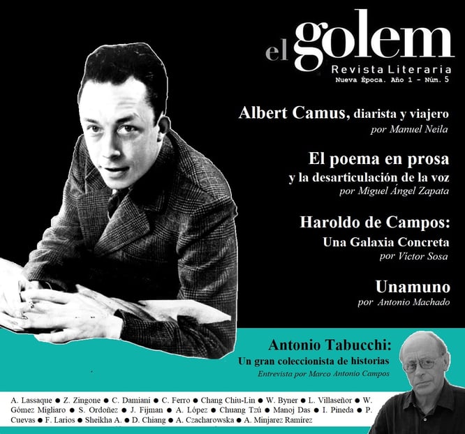 Albert Camus, diarista y viajero. Por Manuel Neila ● Haroldo de Campos: una galaxia concreta. Por Víctor Sosa ● El poema en prosa y la desarticulación de la voz. Por Miguel Ángel Zapata ● Unamuno. Por Antonio Machado ● Antonio Tabucchi: un gran coleccionista de historias. Entrevista por Marco Antonio Campos ● Poesía de Aurelia Lassaque (traducción de Zingonia Zingone) ● Poesía de Claudio Damiani (traducción de Carmen Leonor Ferro) ● El largo pensamiento de la noche. Un poema de Chang Chiu-Lin 673-740 (traducción de Witter Byner, Laura Villaseñor) ● Tres poemas del libro inédito Tokapus, de Willy Gómez Migliaro ● Poesía de Anna Czacharowska (traducción de Alicia Minjarez Ramírez) ● Antiguo canto del Sol, de la Luna y del temor a la Soledad. Canto esquimal, anónimo (traducción de E. L.) ● Poesía de Saúl Ordoñez ● Poesía de Francisco Larios ● Seis poemas del libro Molino Rojo de Jacobo Fijman ● Cosas de la Abuela. Servicio al Cliente. Dos cuentos cortos por Aída López ● ¡Qué profundo es el Tao! (Cuento) Chuang Tzú ● Adiós a un Fantasma. Un cuento de Manoj Das ● Del rojo deseo que nos tiñe por completo. Reseña del libro Naxiña’ Rului’ Ladxe’ / Rojo deseo de Irma Pineda. Por Paloma Cuevas. ● Poesía de Sheikha A. (traducción de Dulce Chiang)