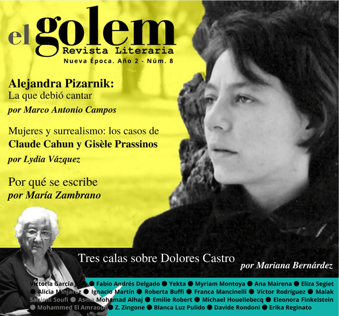 Alejandra Pizarnik: La que debió cantar. Por Marco Antonio Campos ● Tres calas sobre Dolores Castro. Por Mariana Bernárdez ● Mujeres y surrealismo: los casos de Claude Cahun y Gisèle Prassinos. Por Lydia Vázquez ● Por qué se escribe. Por María Zambrano ● Poesía de Mohammed El Amraoui. Traducción de Zingonia Zingone ● Poesía de Blanca Luz Pulido ● Davide Rondoni y la memoria encendida. Introducción, selección y traducción de Erika Reginato Muñoz ● Poesía de Eleonora Finkelstein ● La búsqueda de la felicidad: poemas de Michael Houellebecq. Traducción de Emilie Robert ● Poesía de Asma Mohamad Alhaj. Traducción de Malak Sahioni Soufi ● Cinco canciones raras. Del libro inédito, boquiabierto de Víctor Rodríguez Núñez ● Libretto di transito: prosa poética de Franca Mancinelli. Traducción de Roberta Buffi ● Poesía de Ignacio Martín ● Fantasías verdaderas. Poesía de Eliza Segiet. Traducción de Alicia Minjarez Ramírez ● Poesía de Yekta, del libro Registro de las Sombras. Traducción de Myriam Montoya ● Poesía de Fabio Andrés Delgado Micán ● Majakuagy-Moukeia (Cap.1) de Ana Mairena ● Minificciones de Victoria García Jolly ●